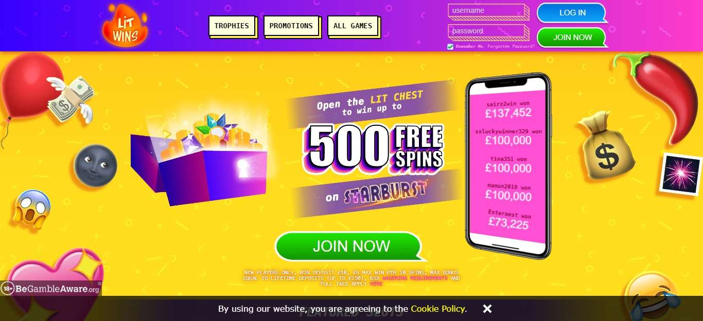Lit Wins Casino is a UK online casino offering the hottest slot games around. Choose from hundreds of exciting slot machines with huge jackpots, instant win scratch card games, and thrilling casino games including blackjack and roulette. Take your favourite games with you on the go and play anywhere, anytime on your mobile or tablet. Plus, join Lit Wins today, spin the Mega Reel and win up to 500 free spins on Starburst!