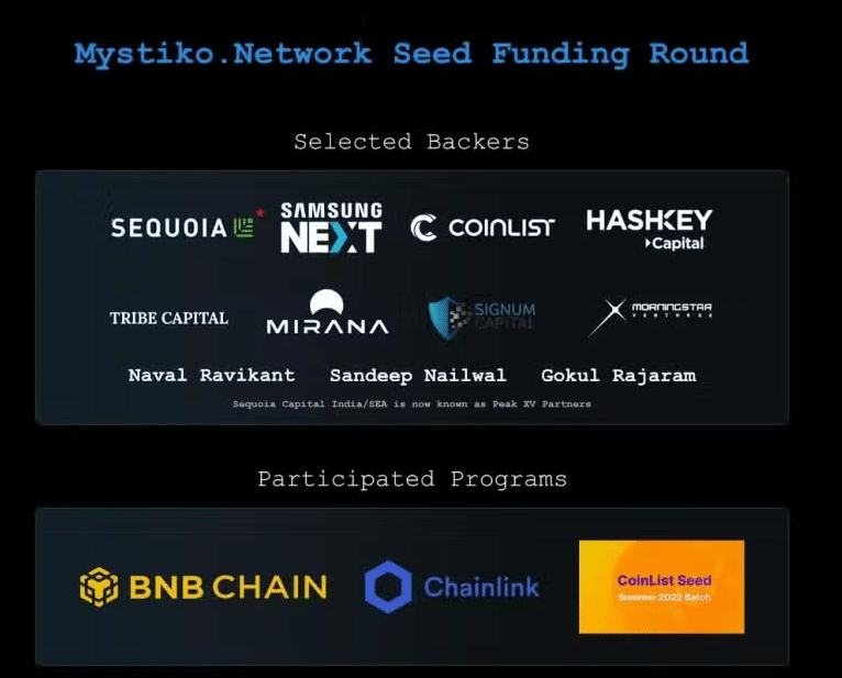 Mystiko.Network, the leading Base Layer of Web3, has completed a 18 Million USD seed funding round led by Sequoia Capital India/SEA (now known as Peak XV Partners), with participation from Samsung Next, Hashkey, Mirana, Signum, Coinlist, Naval Ravikant, Sandeep Nailwal, Gokul Rajaram, Tribe Capital, Morningstar Ventures, etc.